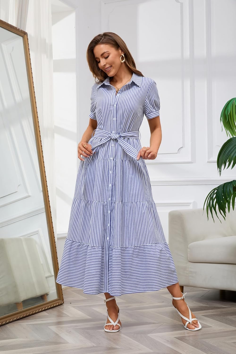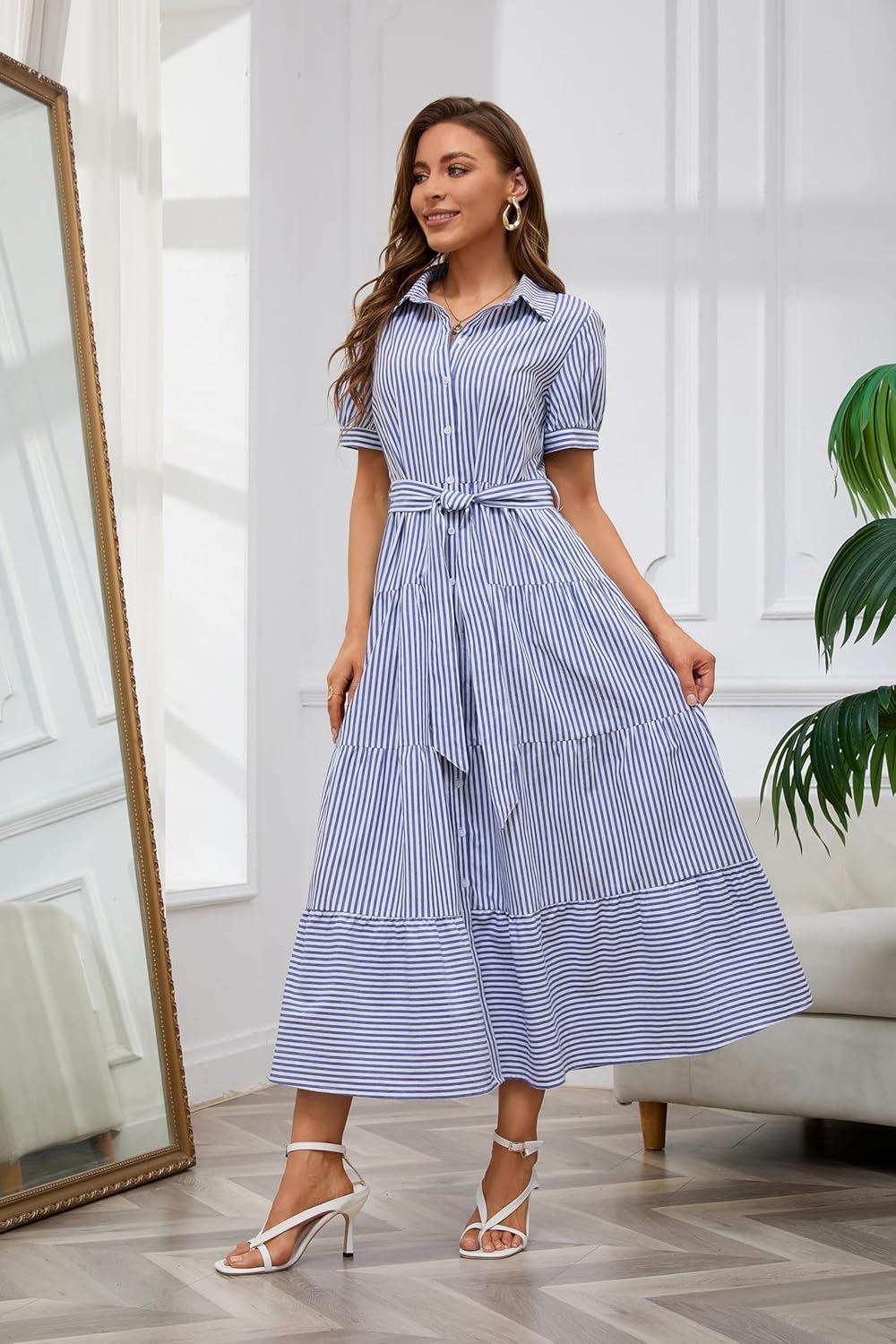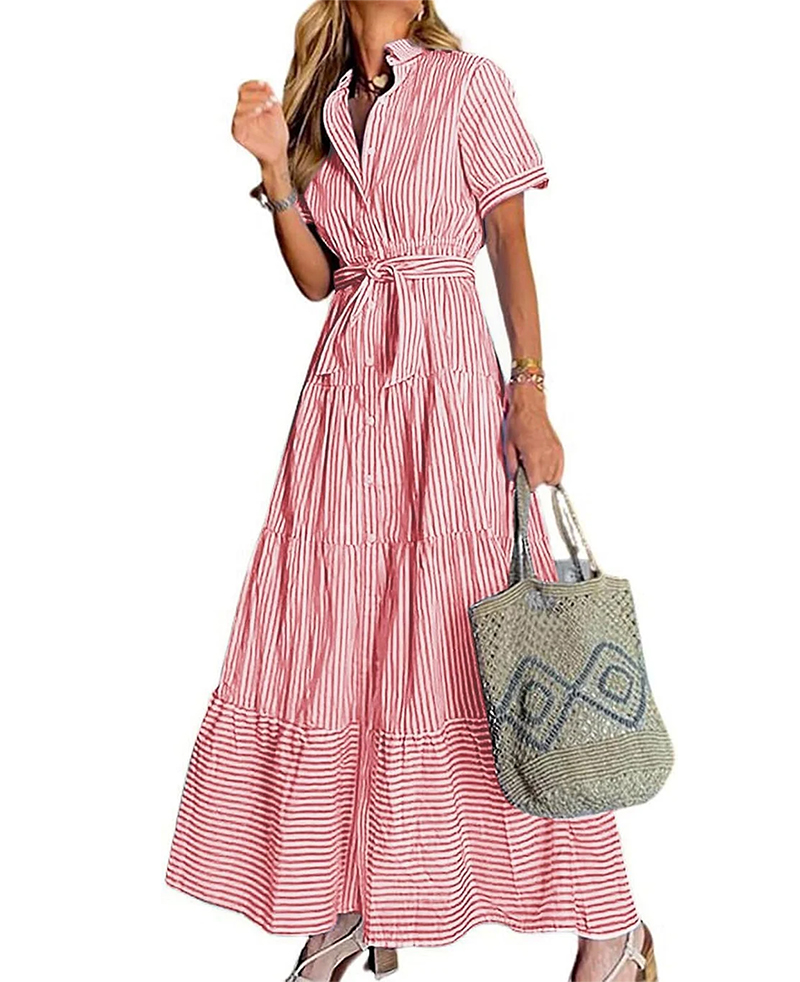 Womens Casual Short Sleeve Button Down Tie Waist Ruffled Striped Maxi Shirt Dress(Buy 2 Free Shipping)