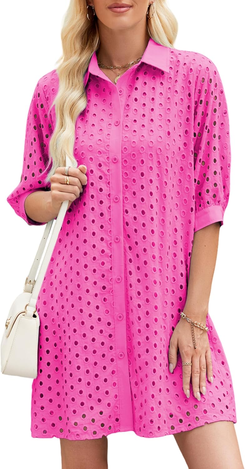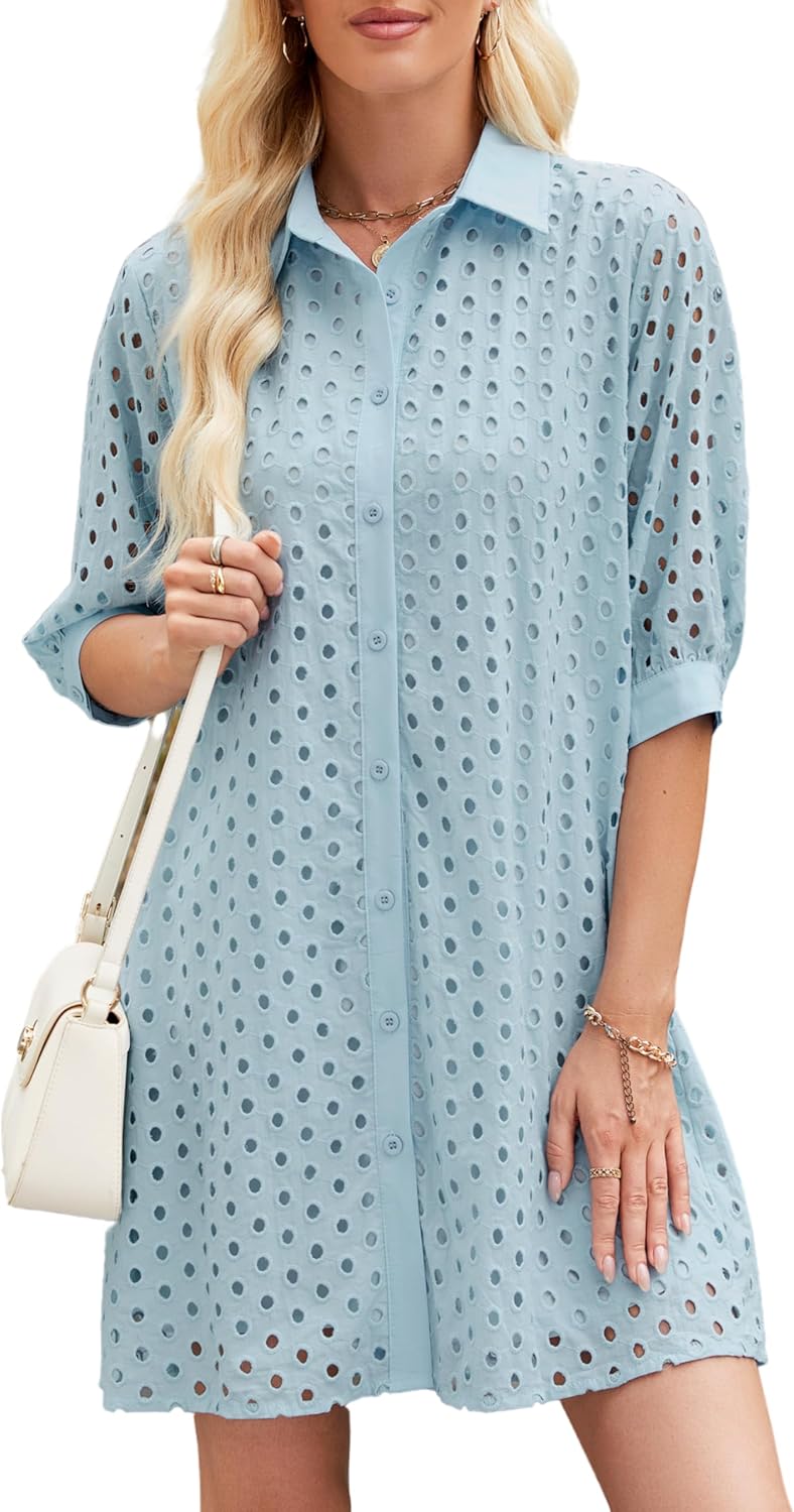 Womens Summer Shirt Dress Eyelet Hollow Out Short Dress with 3/4 Sleeves Button Down Casual Dress Summer Beach Dress